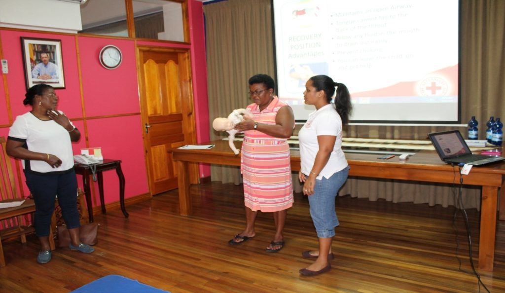 Minor, or even major incidents are not unusual in any child care setting. Even with supervision, children frequently sustain scrapes, bruises, cuts, bites and falls in the normal course of a day. Less frequently, emergencies such as seizures, asthma attacks, and allergic reactions may require immediate medical intervention. As a Childminder the best way to handle such incidents is to always be prepared and this is by updating your knowledge, skills and having the recommended basic supplies at hand.- The Institute of Early Childhood Development (IECD), National Standards on Childminding Regulations, 2016 stipulates that a Childminder should have training in basic Paediatric first aid. It is for this reason that the IECD partnered with the Red Cross Society of Seychelles to develop a training programme in Basic Paediatric First Aid for – Childminders. Present at the ceremony to officially launch the training programme, were the CEO of IECD, Mrs Shirley Choppy and the Secretary General of the Red Cross Society of Seychelles Mrs Collette Servina, who welcomed the participants. The launch which took place on Saturday 24th September coincided with the International Day of First Aid which had ‘First Aid for Children’ as the theme for this year. A first cohort of 9 Childminders attended training sessions on Saturday 24th September and Saturday 1st October, whilst a second group followed the training on Saturday 15th and 22nd October. IECD staff- who work closely with the Childminders also had the opportunity to attend the training in order to better support the participants. The 14 hour training programme consisted of topics related to the management of common emergencies that can occur in babies and toddlers such as fractures, burns or allergic reactions. The Cardio Pulmonary Resuscitation procedure formed part of the training. The instruction which consisted of both theory and practical sessions will be offered on an ongoing basis and is mandatory for all registered Childminders.