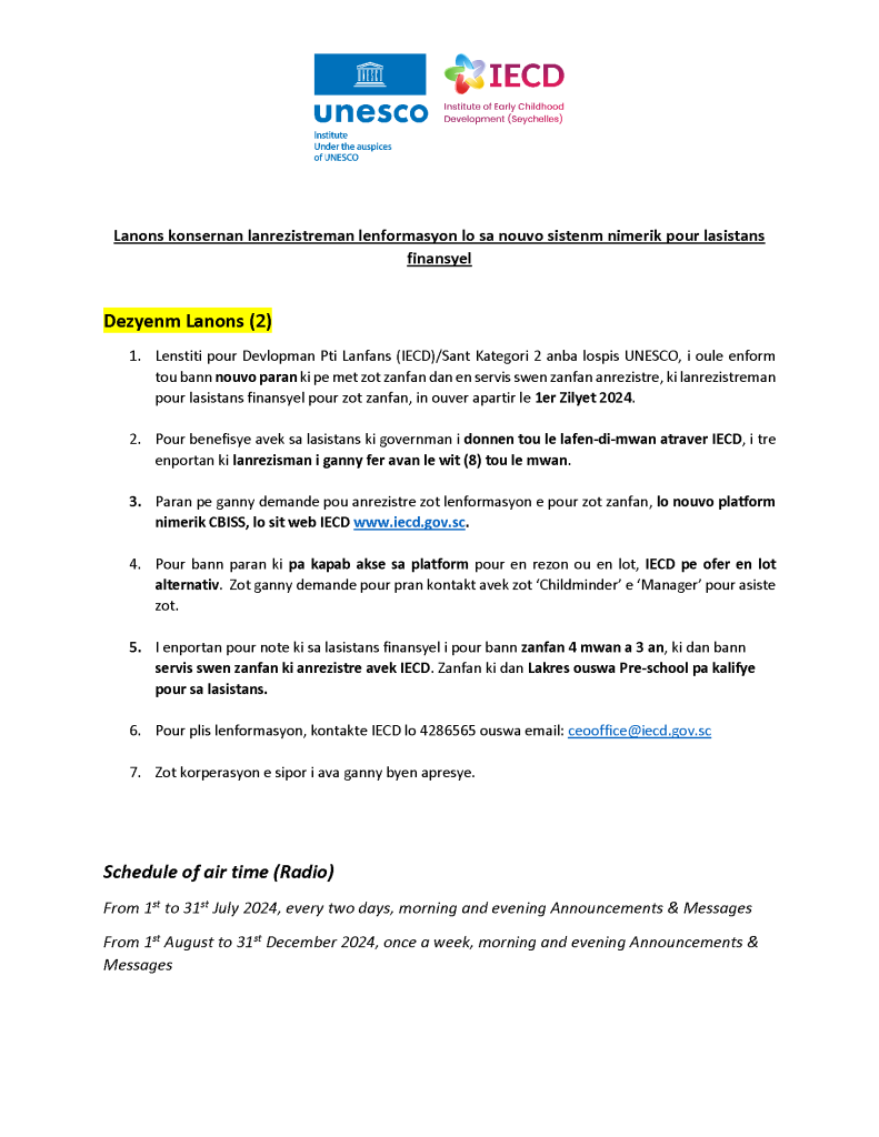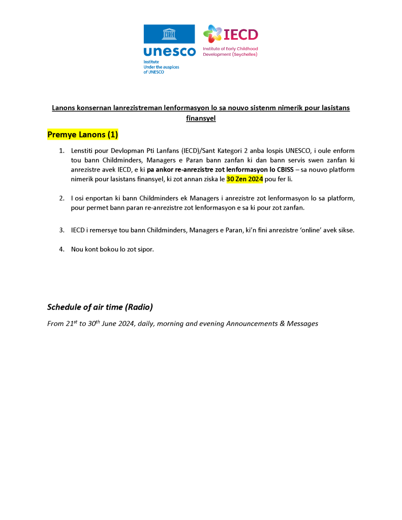 In line with the national drive for the digitalization of services and the Tashkent Declaration, the IECD-UNESCO Category 2 Institute, in collaboration with the Department of Information Communications Technology (DICT), has introduced a new online system in ECCE. The Child Care Benefit Information System Seychelles (CBISS), aims to support the management of the Government’s Financial Assistance scheme for registered child care service providers and parents.