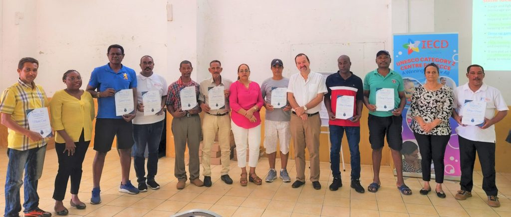 To handover the token of appreciation to the group of fathers was the Chairperson of the IECD Board, Captain David Savy. Other attendees on the day were the Vice Chairperson of the IECD Board, Ms. Sonia Mancienne, management, staff and partners of IECD.