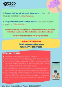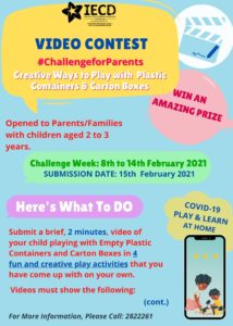 With the Covid-19 home restrictions, the Institute of Early Childhood Development (IECD) has launched a video competition, in which parents are being invited to challenge themselves in coming up with 4 play activities using two main items – the empty plastic containers and carton boxes.