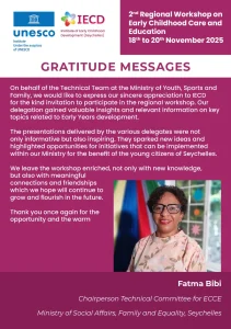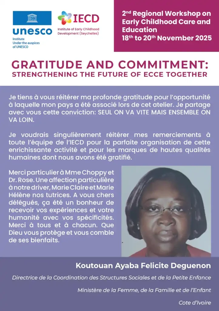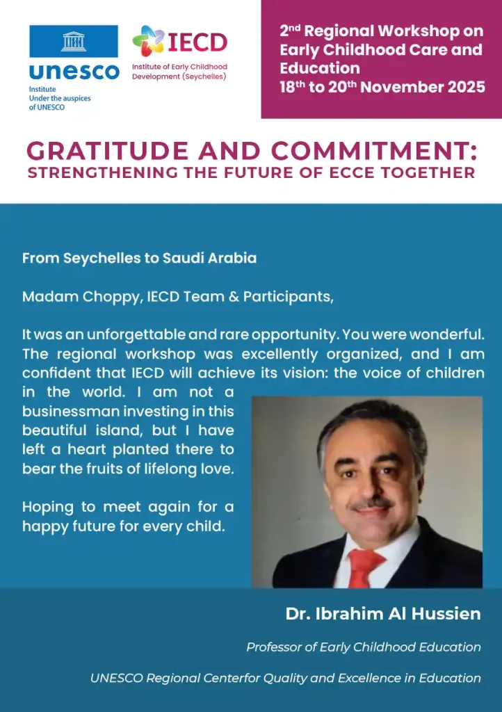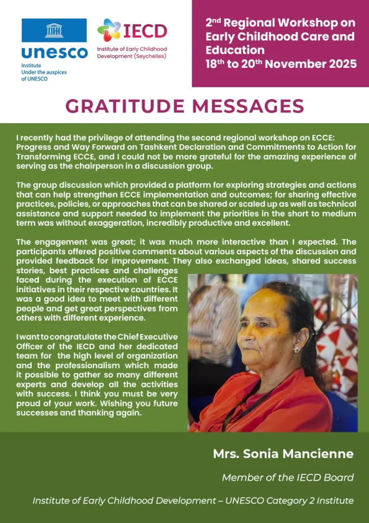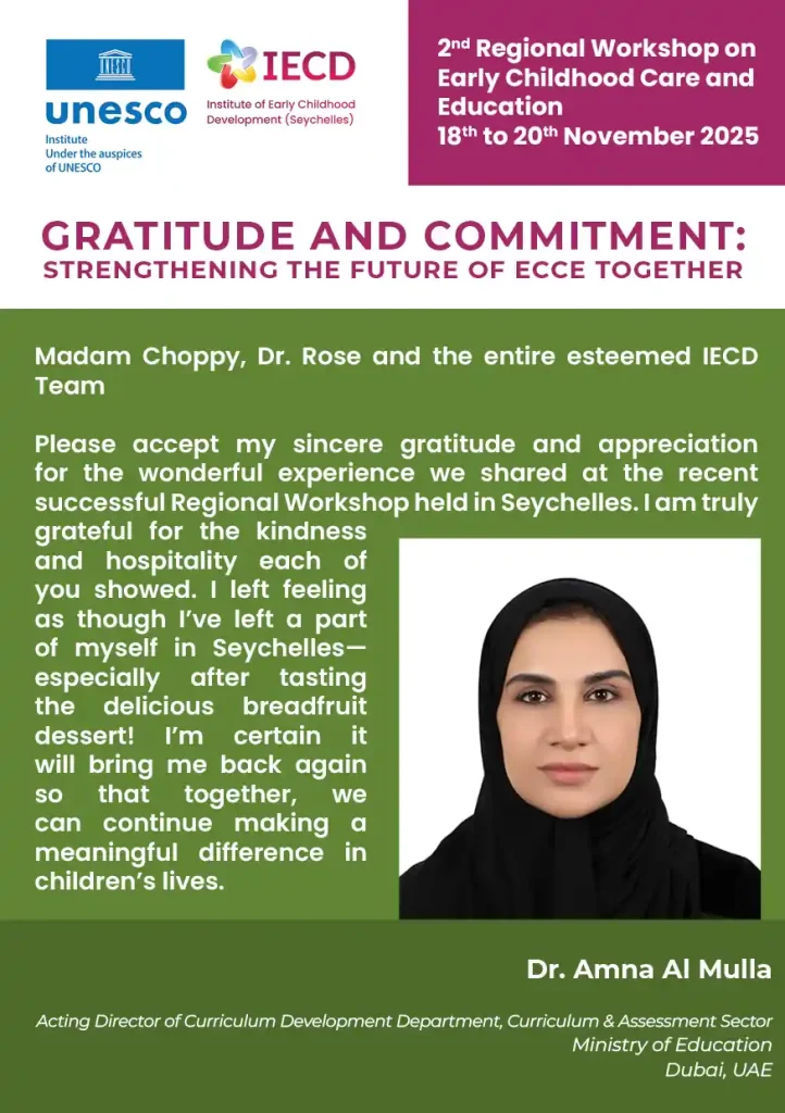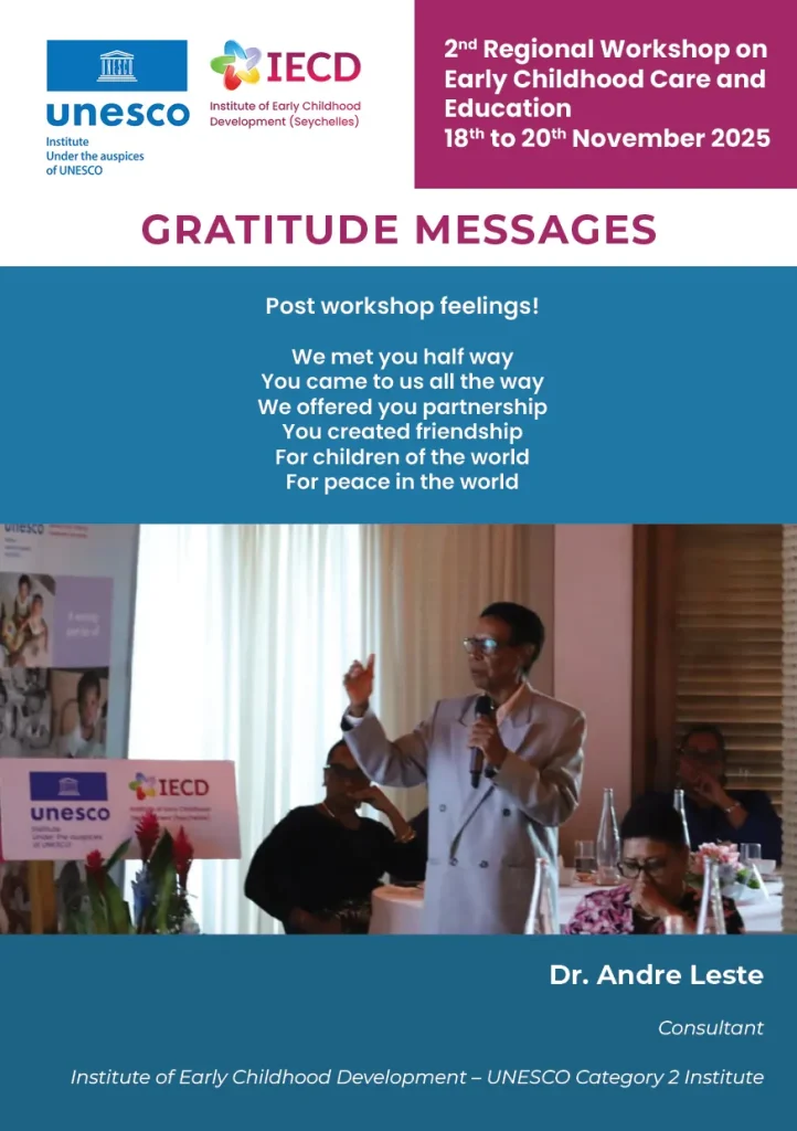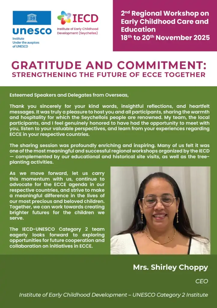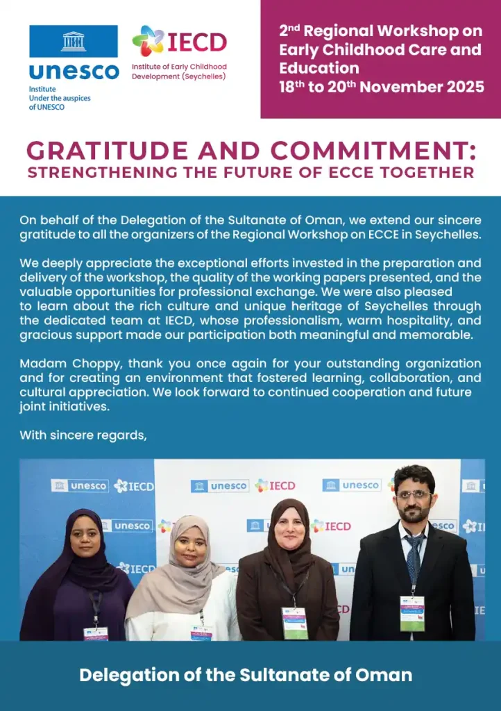 This pivotal event is organized in partnership with the Government of Seychelles, the UNESCO Secretariat, and relevant UNESCO Regional Offices. It will convene policymakers and ECCE professionals from Northern Africa, Western Africa, and the Arab States in Seychelles from November 18th to 22nd.