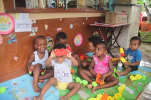 Sabrina i vey dis zanfan aze ant 3 mwan e 4an, e parmi ti’n vin pour la premye fwa zour nou ti pe fer sa antretyen. Konpare ek lezot servis Chilmilding son bann zanfan pa ditou timid. Zot eksite letan zot ganny envite e zot pare pour montre bann nouvo keksoz ki zot in aprann.