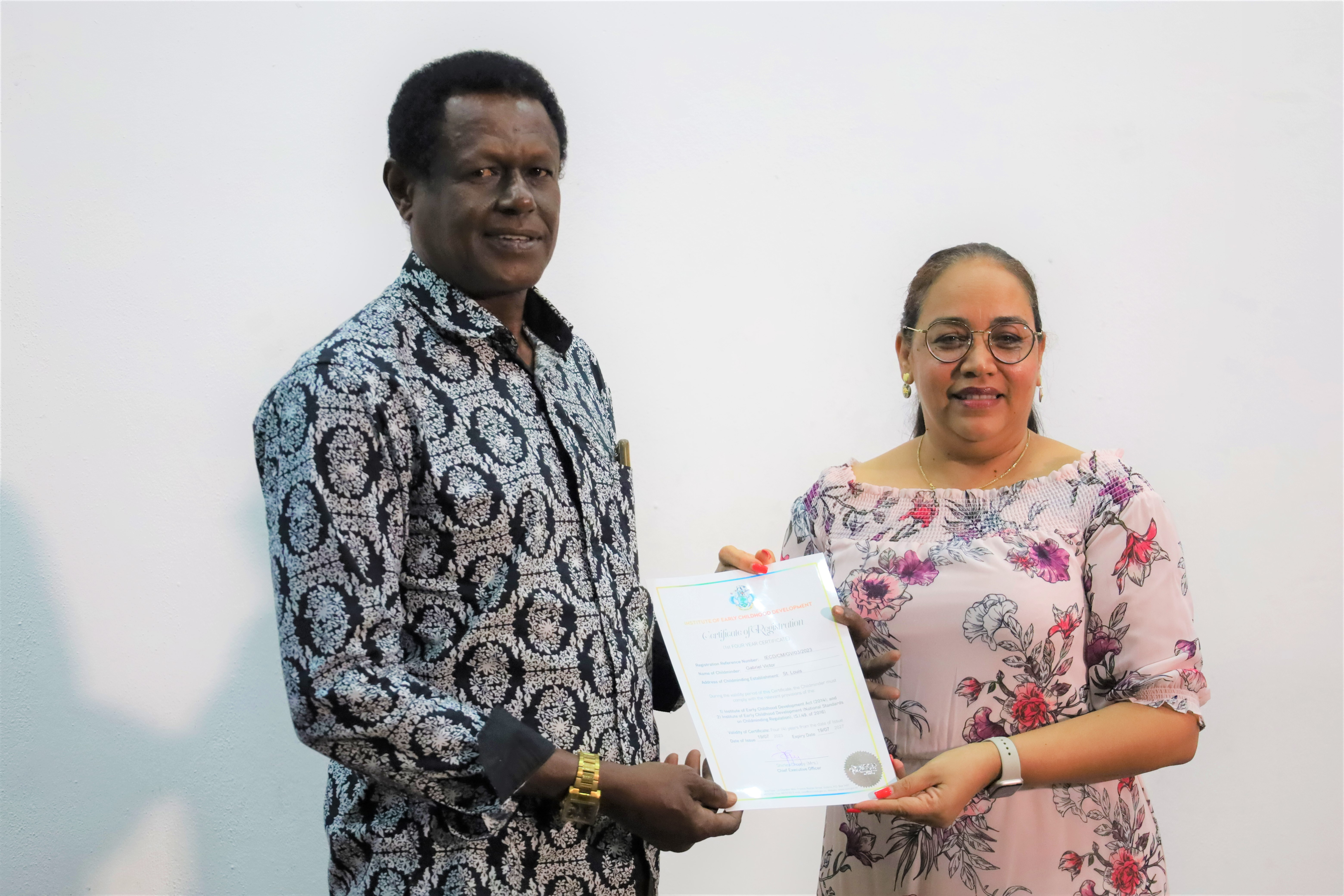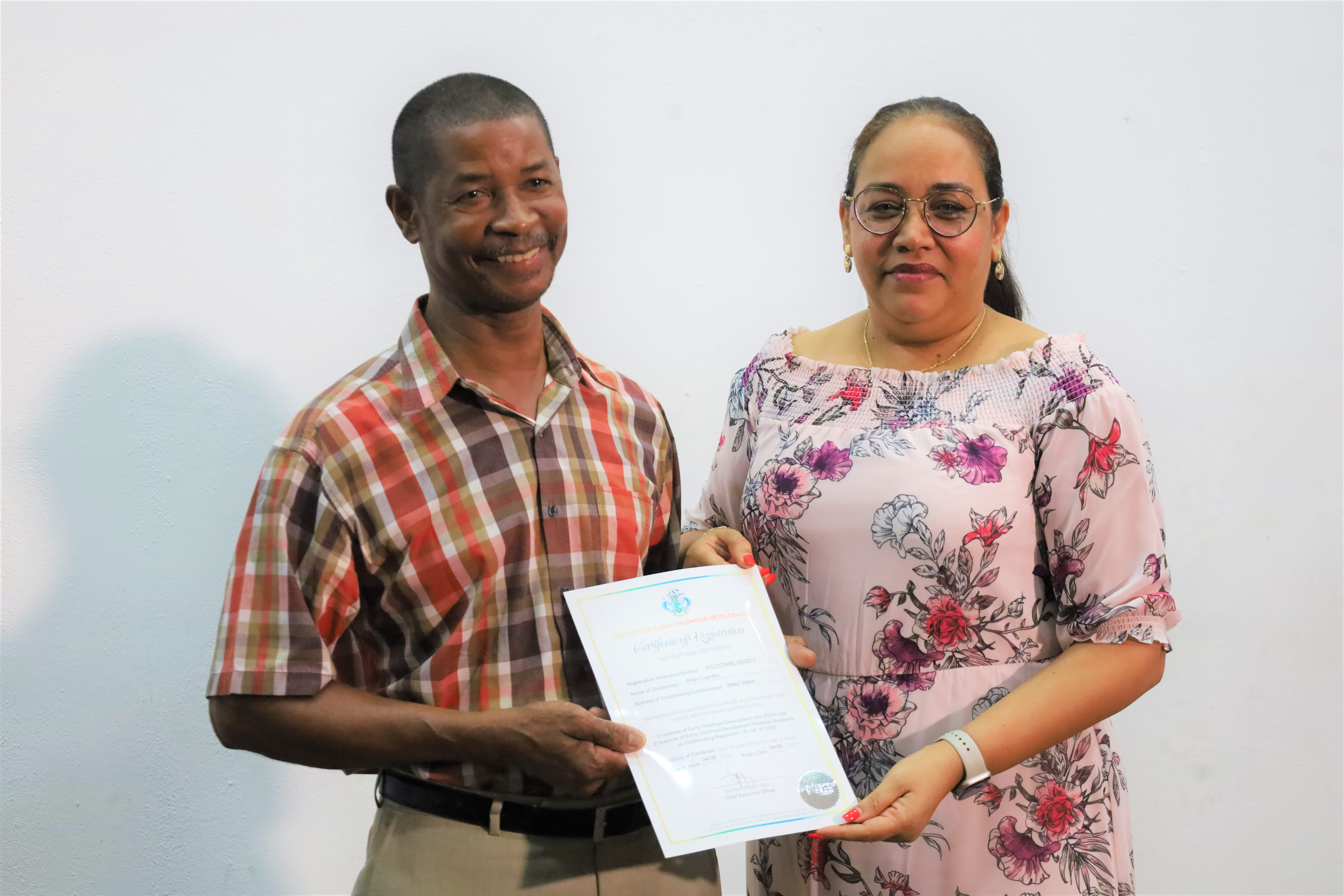 Mrs. Nathalie Moustache, the Director for Regulatory Affairs at IECD explains that the registration of the two male childminders is proof of the work being done by the Institute to encourage more gender balance in the home-based service delivery and the ECCE sector workforce in general. “The number may appear small, but we celebrate small victories as such an achievement in our small island, goes a long way in making a difference in the lives of our young children”.